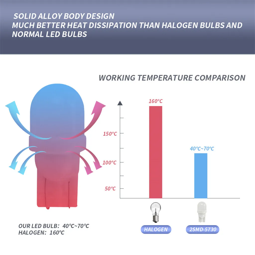 Гораздо лучше рассеивания тепла, чем Галогенные лампы и обычные светодиодный лампы, рабочая температура Сравнение: Галоген: 160 ℃, наш Светодиодный светильник: 40 ℃ ~ 70 ℃