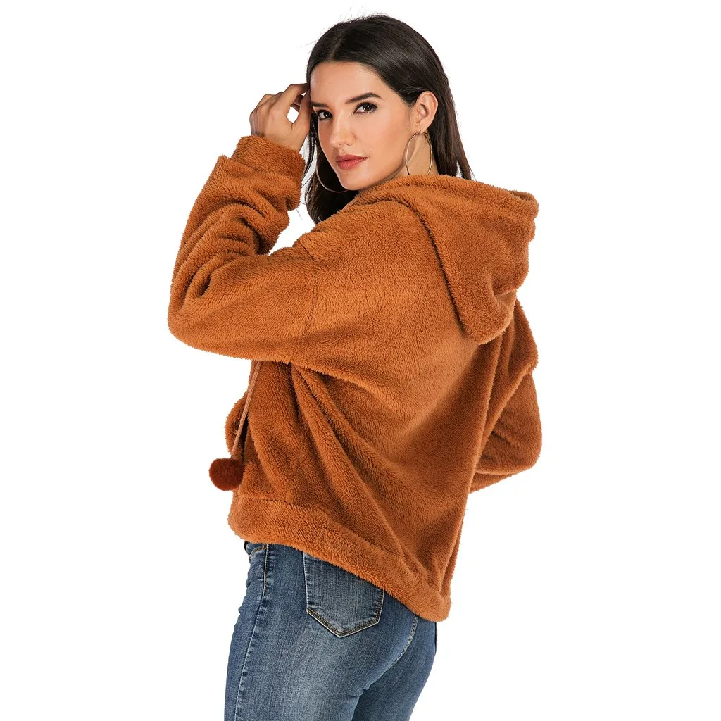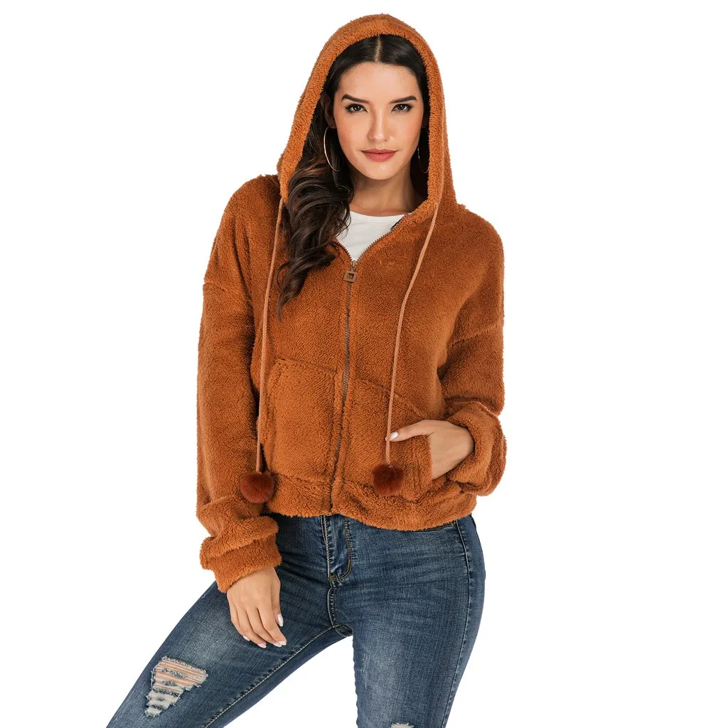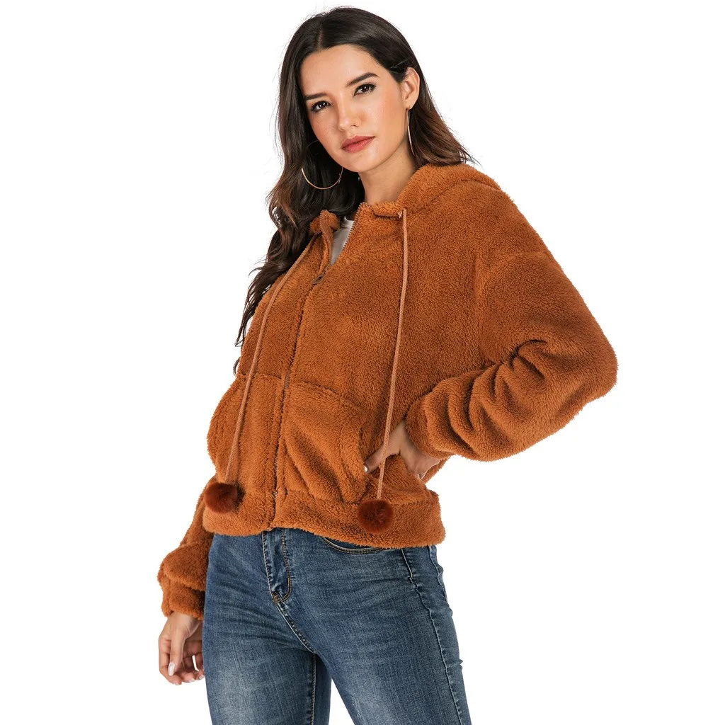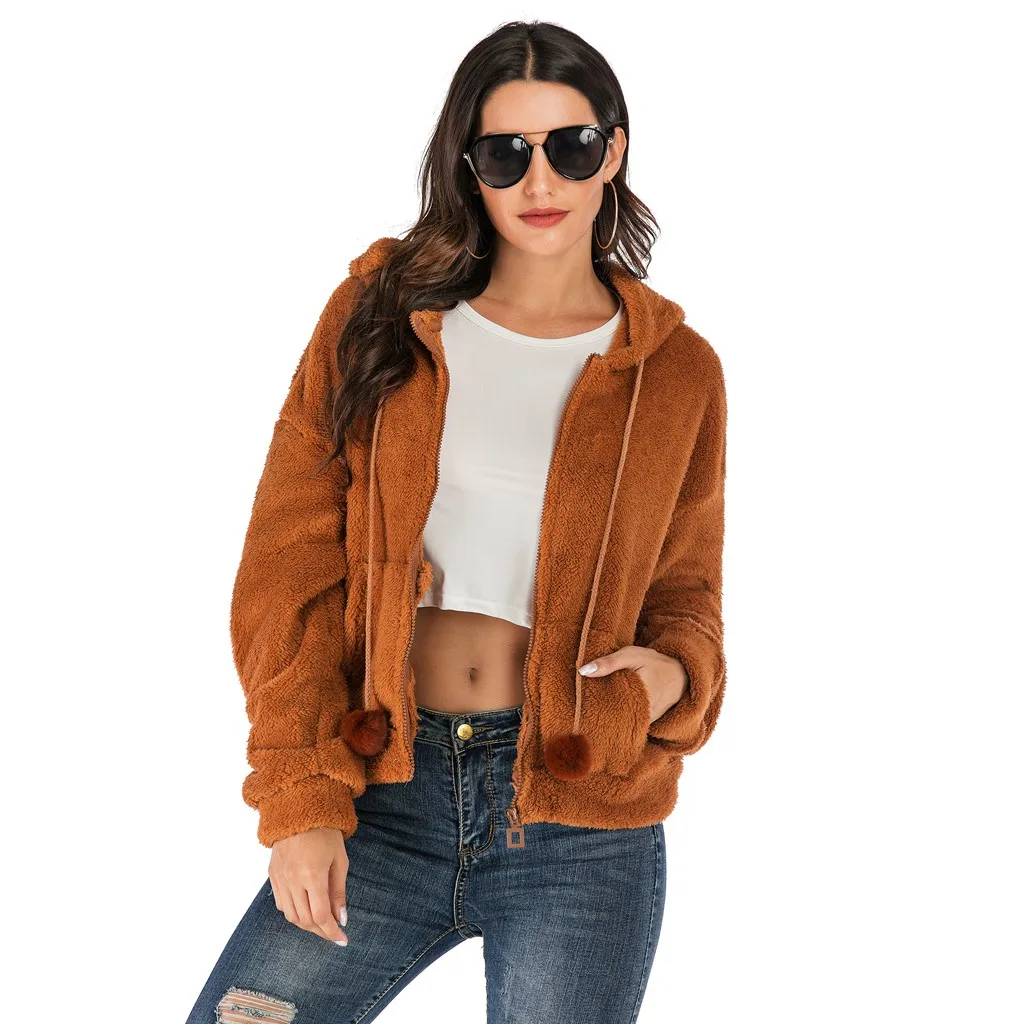 Женская мода сплошной искусственный плюш мяч куртка с капюшоном плюшевая молния свободный карман пальто