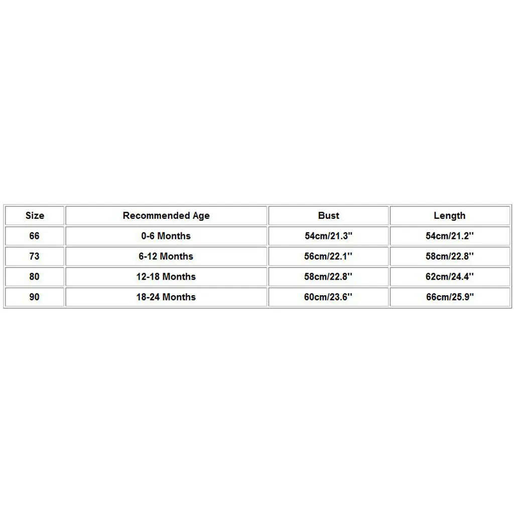 Таблица размеров: РазмерРекомендуемый возрастБюстДлина660-6 месяцев54 см/21,3"54 см/21,2''736-12 месяцев56 см/22,1''58 см/22,8''8012-18 месяцев58 см/22,8''62 см/24,4''9018-24 месяцев60 см/23,6''66 см/25,9"