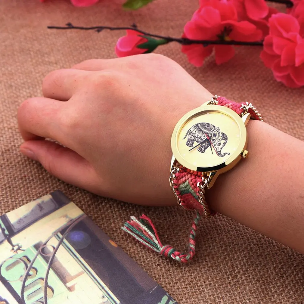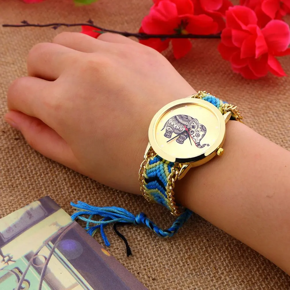 Женские Этнические хлопчатобумажные плетеные Аналоговые кварцевые наручные часы с цепочкой, дизайн слона, новинка, хит продаж