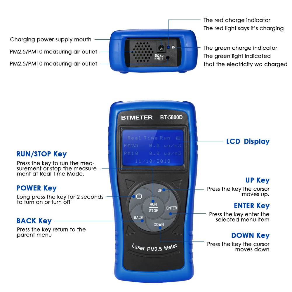 Диапазон испытаний PM2.5 и PM10: 0 ~ 999,9 мкг/м & sup3;, более 999,9 мкг/м & sup3;, отображение всего 999,9 мкг/м & sup3;