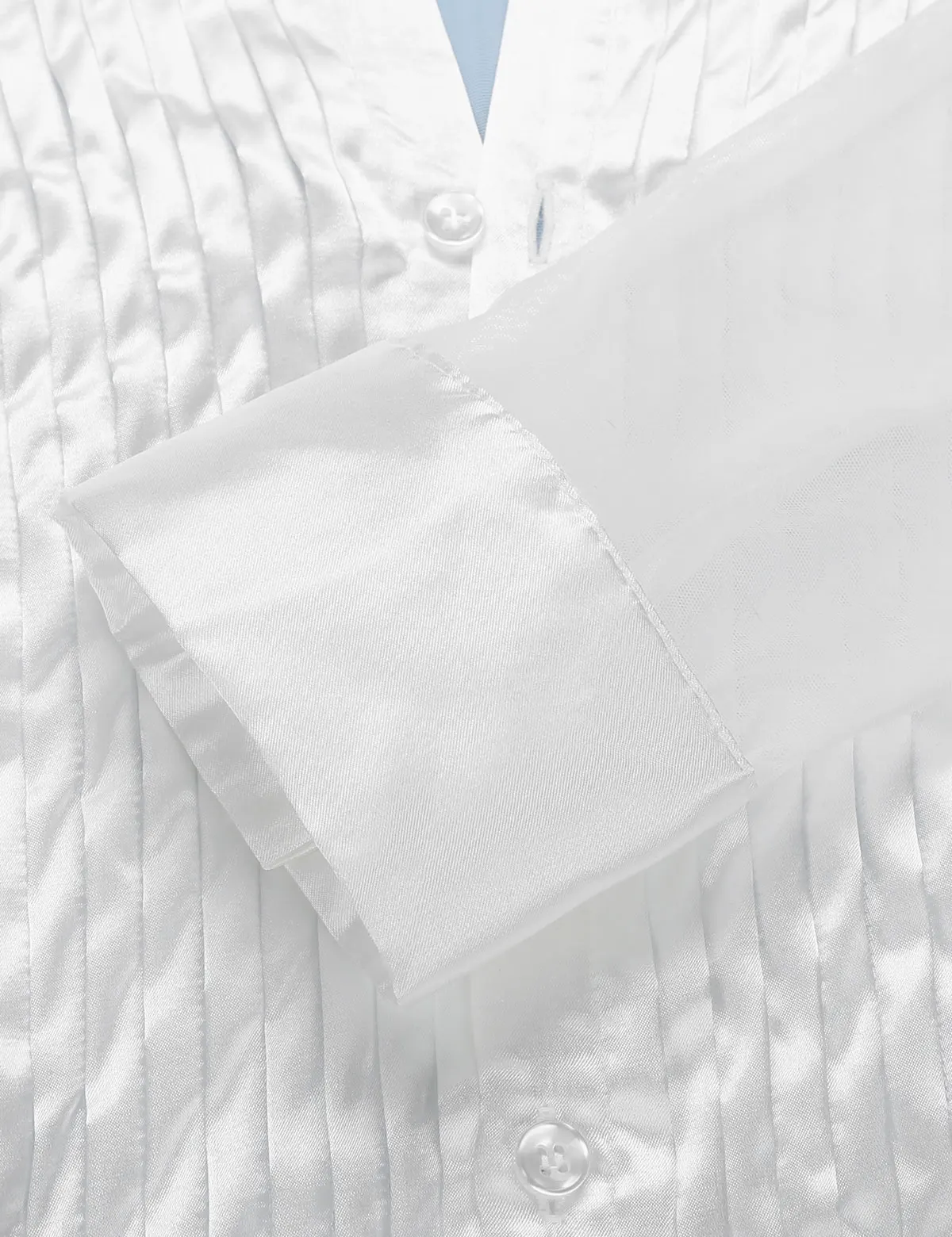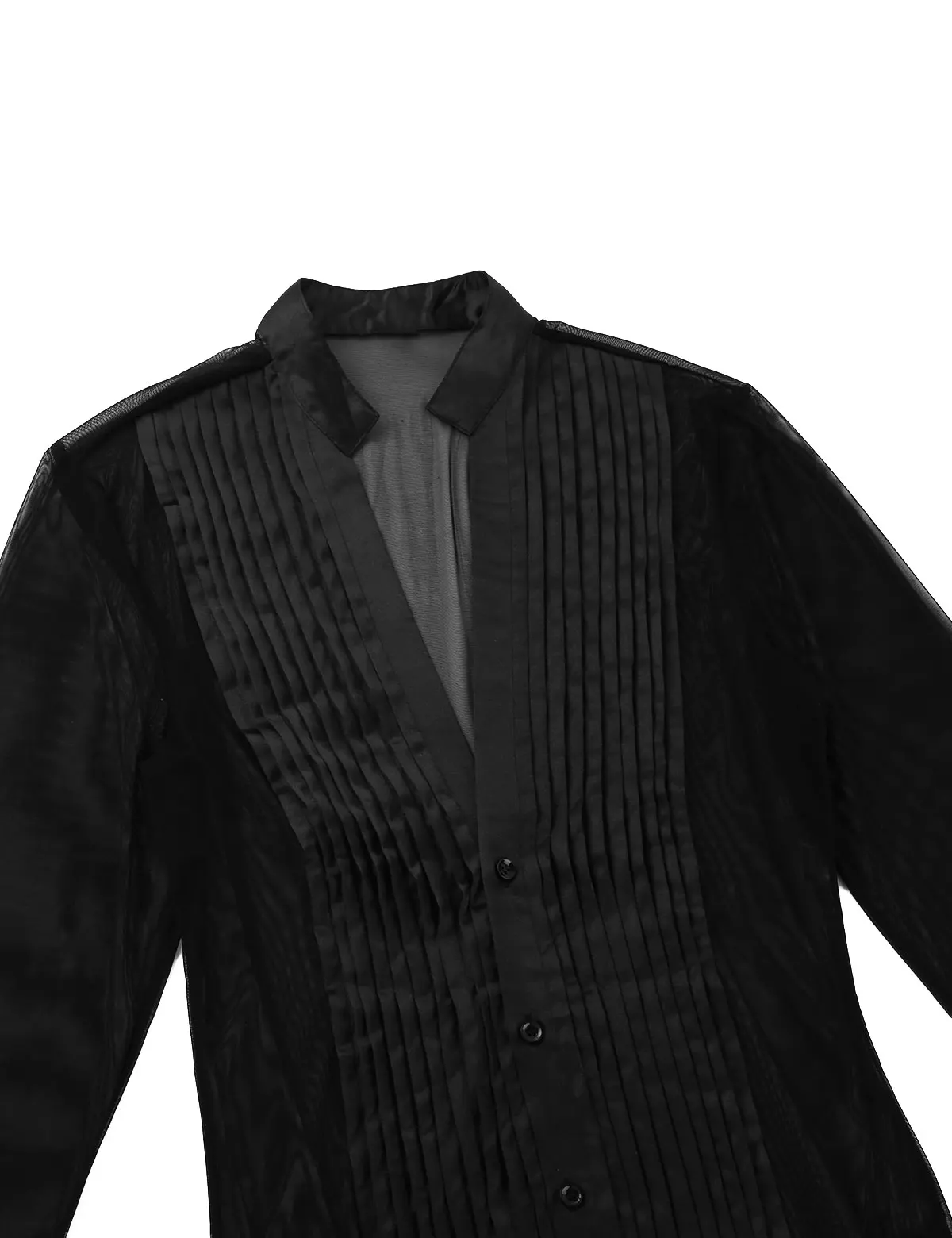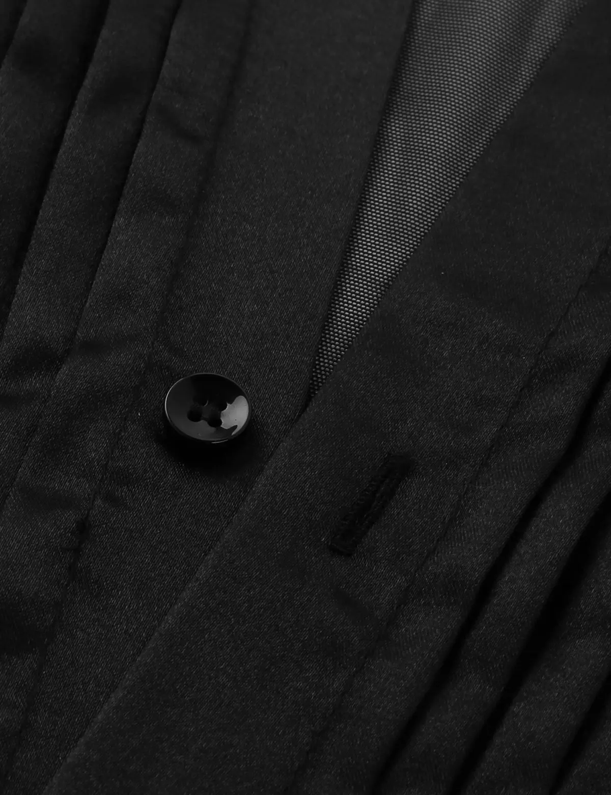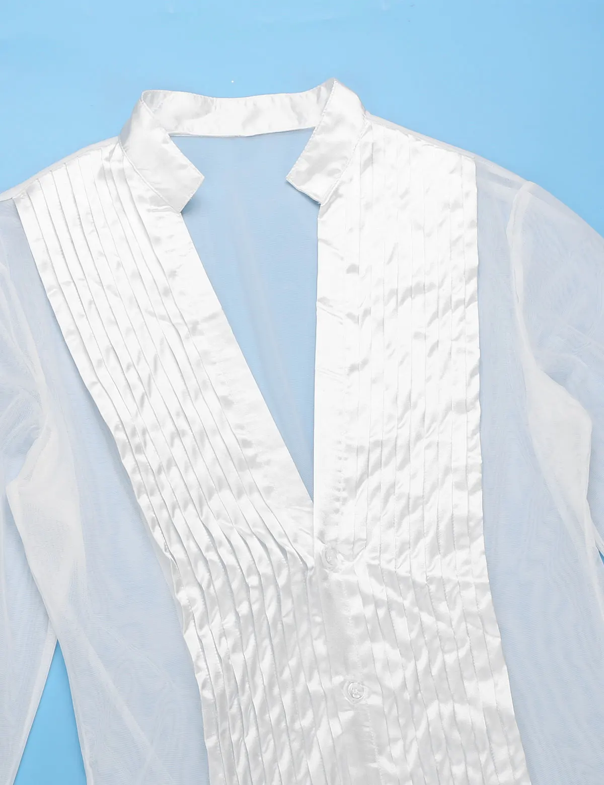 Длинные рукава, глубокий v-образный вырез и гофрированная шелковистая атласная спереди, прозрачная сетчатая ткань, застежка на пуговицах спереди.