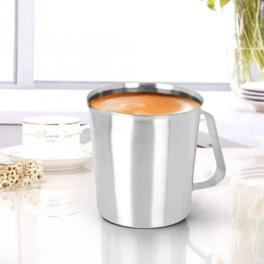 Изготовлен из высококачественной нержавеющей стали, не ржавеет, прочный и долговечный в использовании. Ручка эргономичная и удобная для вас, экономия усилий. 1500 мл большая емкость чашки из нержавеющей стали для молока, удобная и практичная в использовании. Внутренняя шкала является четкой и точной, которая отмечена двумя чешуйками унции и миллилитром. Внутренняя сторона чашки почищена щеткой, что более удобно чистить и устойчиво к загрязнениям. Есть четыре ямы на дне, которые не будут скользить и позволяют чашке надежно разместить на столе. Изысканный дизайн с треугольным носиком делает его более удобным в использовании, анти-капельная и анти-утечка.