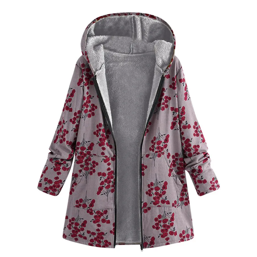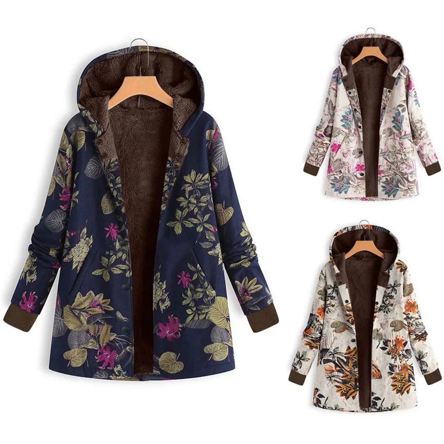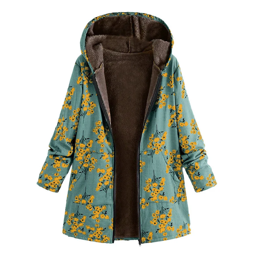 Женская зимняя теплая верхняя одежда с цветочным принтом, с капюшоном и карманами, ВИНТАЖНЫЕ пальто оверсайз