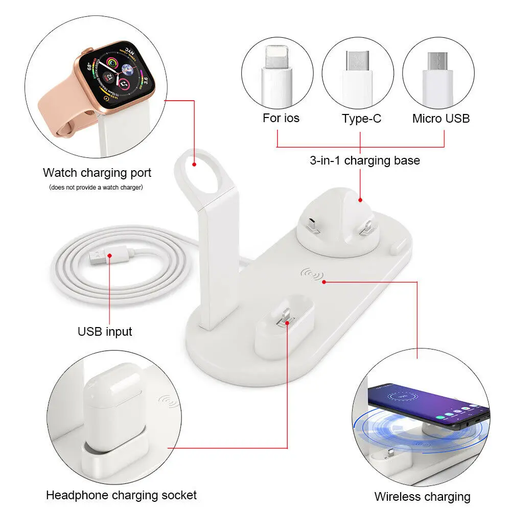 Зарядное устройство с поворотом на 360 градусов, зарядное устройство три в одном для iphone/micro/Type-C, беспроводная быстрая зарядка, подставка для смарт-часов.
