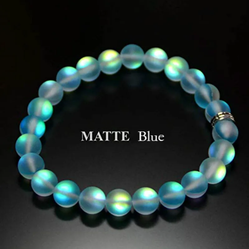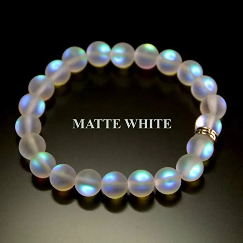 Красивый и потрясающее платье-Русалка aura браслет из бисера, который излучает светящиеся aura из светильник в зависимости от угла наклона бусины под светильник. Бусины имеют отражающую пластину из тонкого лунного камня, которая дает светящееся Радужное отражение.