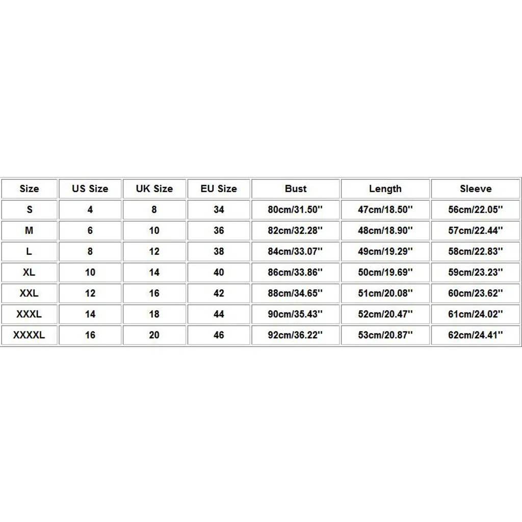 Размер Нам Размеры UK Размеры ЕС Размеры Обхват груди Длина Рукава S 4 8 34 80 см/31,50'' 47 см/18,50'' 56 см/22,05'' М 6 10 36 82 см/32,28'' 48 см/18,90'' 57 см/22,44'' L 8 12 38 84 см/33,07'' 49 см/19,29'' 58 см/22,83'' XL 10 14 40 86 см/33,86'' 50 см/19,69'' 59 см/23,23'' XXL 12 16 42 88 см/34,65'' 51 см/20,08'' 60 см/23,62'' XХХL 14 18 44 90 см/35,43'' 52 см/20,47'' 61 см/24,02'' XXXXL 16 20 46 92 см/36,22'' 53 см/20,87'' 62 см/24,41''