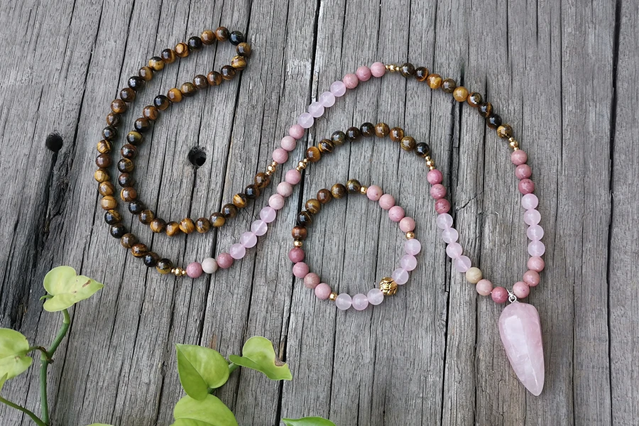 Descripción 8mm Natural Stone Beads, Rhodrochrosite, Rose Quartz And Rose Quartz Pendant, Tigers Eye, JapaMala Sets, Spiritual Jewelry, Meditation Beads, Inspirational Jewelry Gift For You. ---------------------------------------------------------------------------- ☆MEANING OF BEADS Rhodrochrosite Enhances spirituality and attuning to ones higher self. Expands consciousness, channeling spiritual awareness. It soothes the heart and comforts the soul, aides in inner peace and self love. Rose Quartz And Rose Quartz Pendant Unconditional love, compassion, peace, tenderness, happiness, warmth, passion, healing, nourishment and comfort. Helps you find true love within yourself above all. Tigers Eye Is a protective stone, strengthening and grounding. Restores equilibrium in your life. Helps you accomplish your goals. Brings confidence and optimism. ---------------------------------------------------------------------------- ☆SIZE: Bracelet Total Long :18.8cm Necklace Total Long :92cm ( Without Pendant ) -Please make sure to measure your wrist with a cloth measuring tape and choose the exact wrist size for you before purchasing. -If you need other size, please leave a massage to me. I will made it for you. -If you have a favorite Mala picture and design ideas, please contact me, I will help you customize your favorite Mala. Let's create Mala together. -Because the stone is natural, each batch will have a size difference of 0.5mm~1mm and a change in color depth, which is caused by the natural formation of natural ore, miner collection and process. Please understand. In addition, the color of the stone will change under different light. The picture taken by the natural glare, and the stone color taken by the camera is light, which is a very normal phenomenon. If you don't know the stone, you can contact the seller. She will tell you. -If you have a favorite Mala picture and design ideas, please contact me, I will help you customize your favorite Mala. Let's create Mala together. ---------------------------------------------------------------------------- ☆NOTES: -I do not recommend swimming or showering while wearing beaded jewelry. -Photographed in natural daylight though colors can differ on different screens. -Shipping is not include on the price. All items ship 'First Class' within 3-5 days of receiving payment. -If you have any question, you can contact me a message and i will be glad to answer you. Let me know if you want any custom orders and I will do my best to accommodate your request! ---------------------------------------------------------------------------- Thank you so much for stopping by Sunflower Shop❤