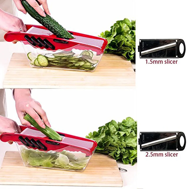-Простота в использовании, мандолин слайсер Улучшает ваши навыки приготовления мгновенно от новичка до повара, овощерезки Лезвия легко установить и сбросить, очень быстро разная толщина и разнообразие стилей