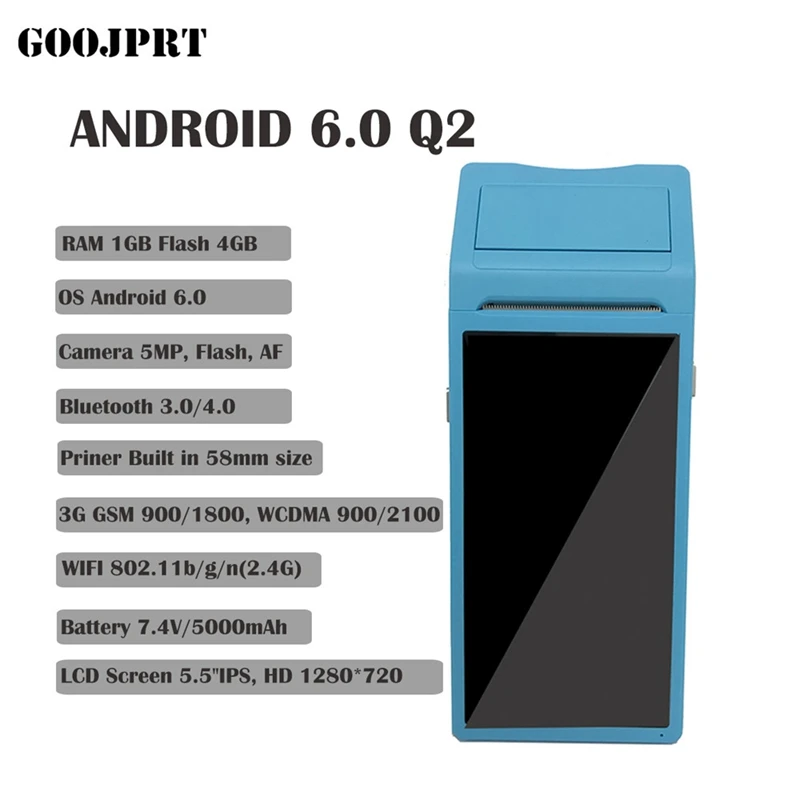Основной аккумулятор: перезаряжаемый литиевый Аккумулятор 7,4 В 5200 мАч. скорость печати: 90 мм/с. android 6,0 OS. связь: WCDMA, wifi, bluetooth. Камера 8 м. 58 дюймовый термопринтер с рулоном бумаги 40 мм. SDK и техническая поддержка. 7.4В 5200 мАч литиевый аккумулятор. ОС Android 6.0.CPU четырехъядерный 1,3 GHz MT6580V/WA