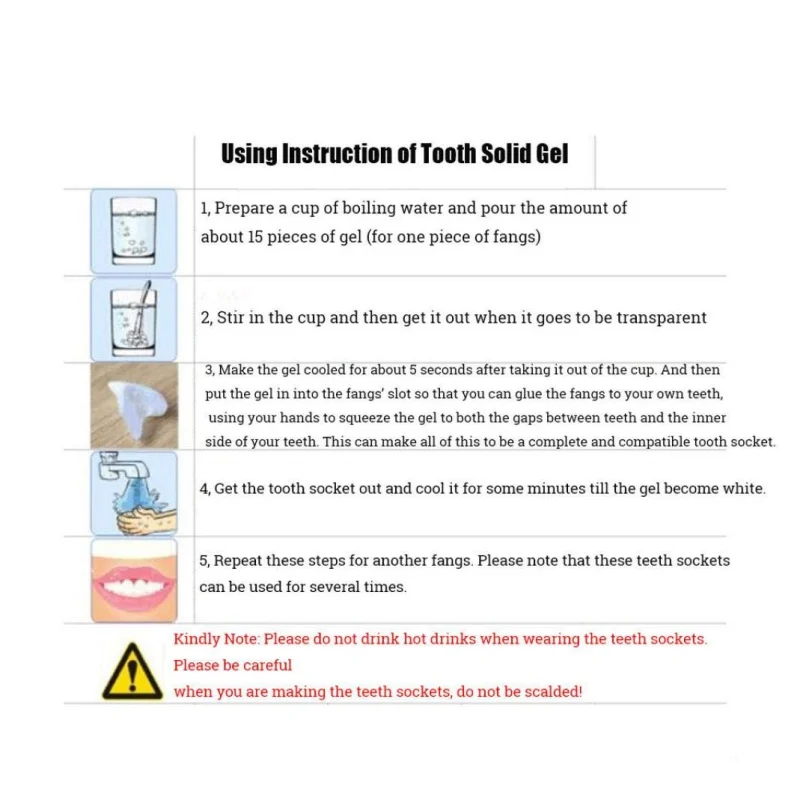 3, сделайте гель охлажденным в течение 5 секунд после того, как вынуть его из чашки. И затем поместите гель в клыки, чтобы вы могли приклеить клыки к своим собственным зубам, используйте руки, чтобы выдавить гель на промежутки между зубами и внутренней стороной зубов. Это может сделать все это, чтобы быть полной и совместимой зубная расщелина.