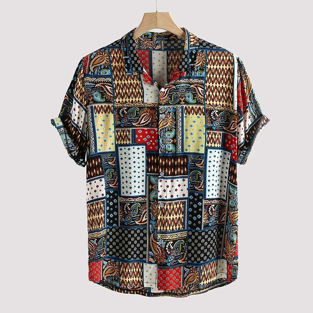 Мужская винтажная Повседневная рубашка с принтом в этническом стиле, с коротким рукавом и стоячим воротником