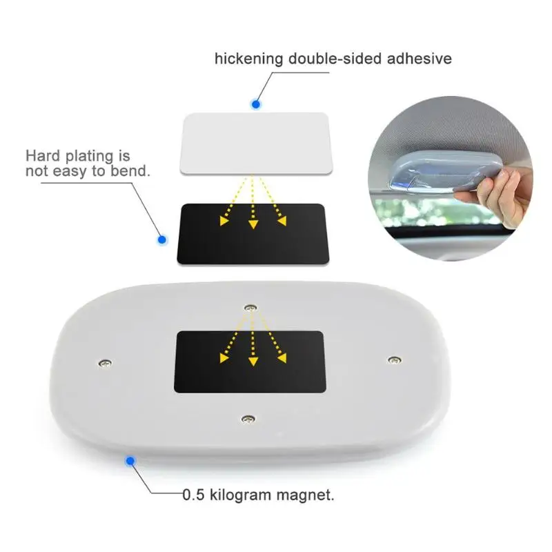 Магнитные поглощения без повреждений; Двухсторонняя клейкая лента фиксации, не повреждая потолок автомобиля;