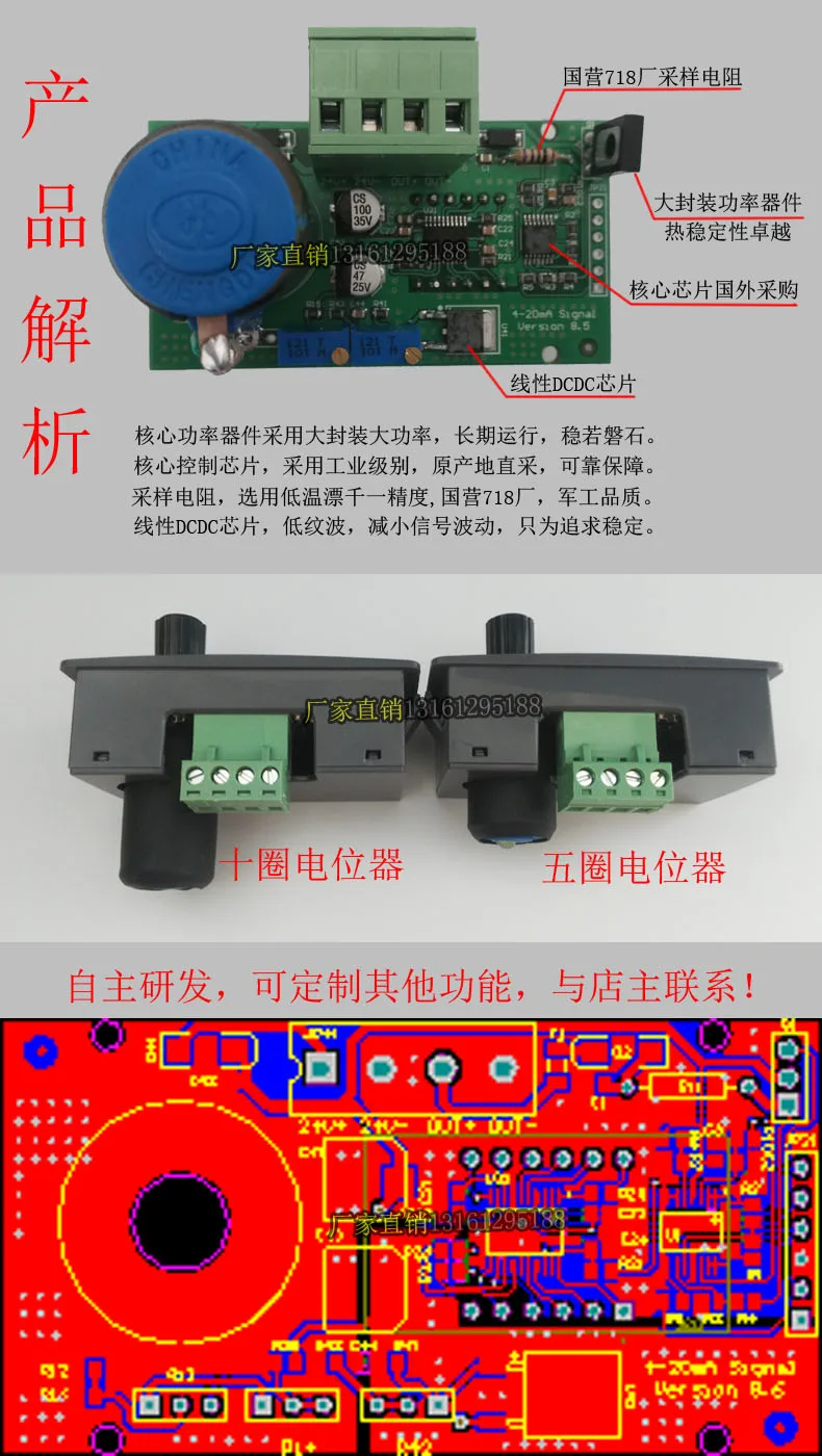 Этот продукт, принцип точности дизайна и точность выбора компонентов составляет 0.1%, разрешение цифрового дисплея составляет 0. 1 мА, то есть 0. Точность 5%, клиент может оценить точность отображения Gao Wang в соответствии с ходом вращения потенциометра, тем самым достигая более точного контроля выхода. Например, при регулировке выхода от маленького до большого, когда цифровой дисплей трубки только что стал 10,0 мА, фактический выход измеряется до 10. 0 мА с мультиметром, затем продолжайте вращать на 5,75 градусов (5 кругов) или на 11,25 градусов (10 кругов), а выход-на 10,05. Ма. То есть общая точность составляет около 0.25%.