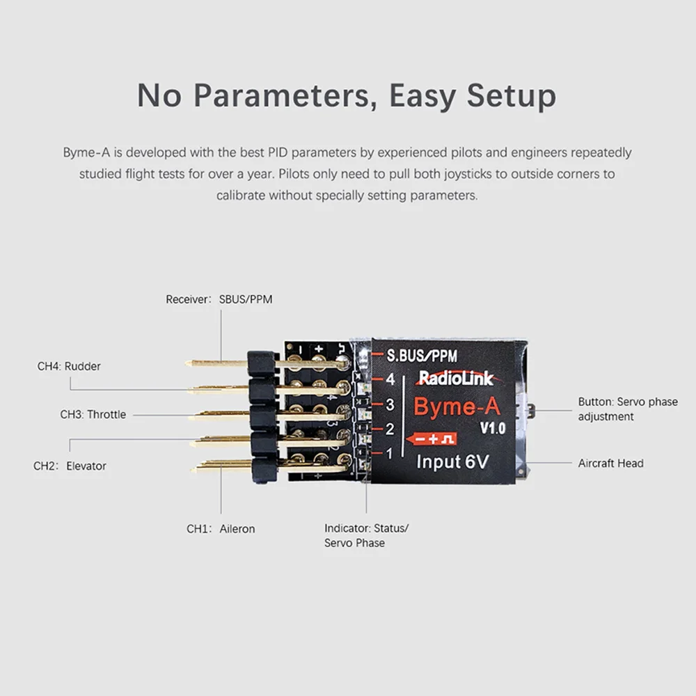 Нет параметров, простота установки: Byme-D разработан с наилучшими ПИД-параметры опытными пилотами и инженерами, которые несколько раз изучали летные тесты в течение более года. Пилотам нужно всего лишь вытянуть оба джойстика к внешним углам, чтобы откалибровать без специальной установки параметров.