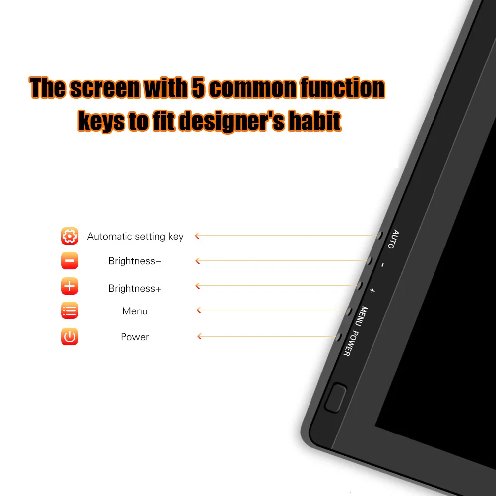 【Регулируемая подставка и лицевая сторона:С сильной регулируемой подставкой для удовлетворения различных потребностей углов, Углы наклона 10 °-85 ° для регулировки, прочные и надежные. Экран с 5 обычными функциональными клавишами быстрого доступа, чтобы соответствовать привычке дизайнера. С несколькими интерфейсами на задней панели, HD IN, usb-портом и DC IN.