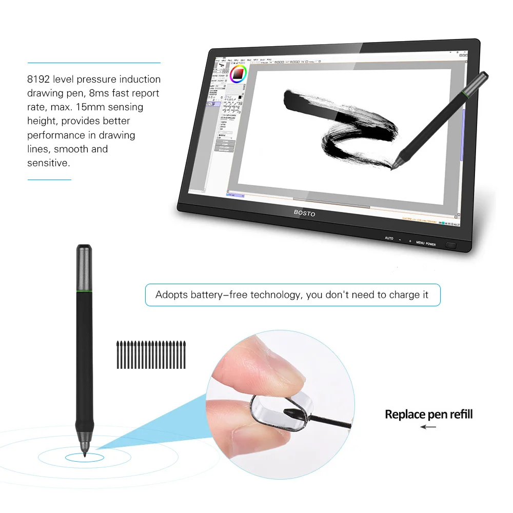 【Высокочувствительный Рисунок:Индукционная ручка для рисования 8192 уровня давления, быстрая скорость отчета 8 мс, максимальная высота чувствительности 15 мм, обеспечивает лучшую производительность линий рисования, плавность и чувствительность. Использует технологию без батареи, вам не нужно заряжать ее, с 2 кнопками может быть назначена как щелчок мыши или любая другая функция.
