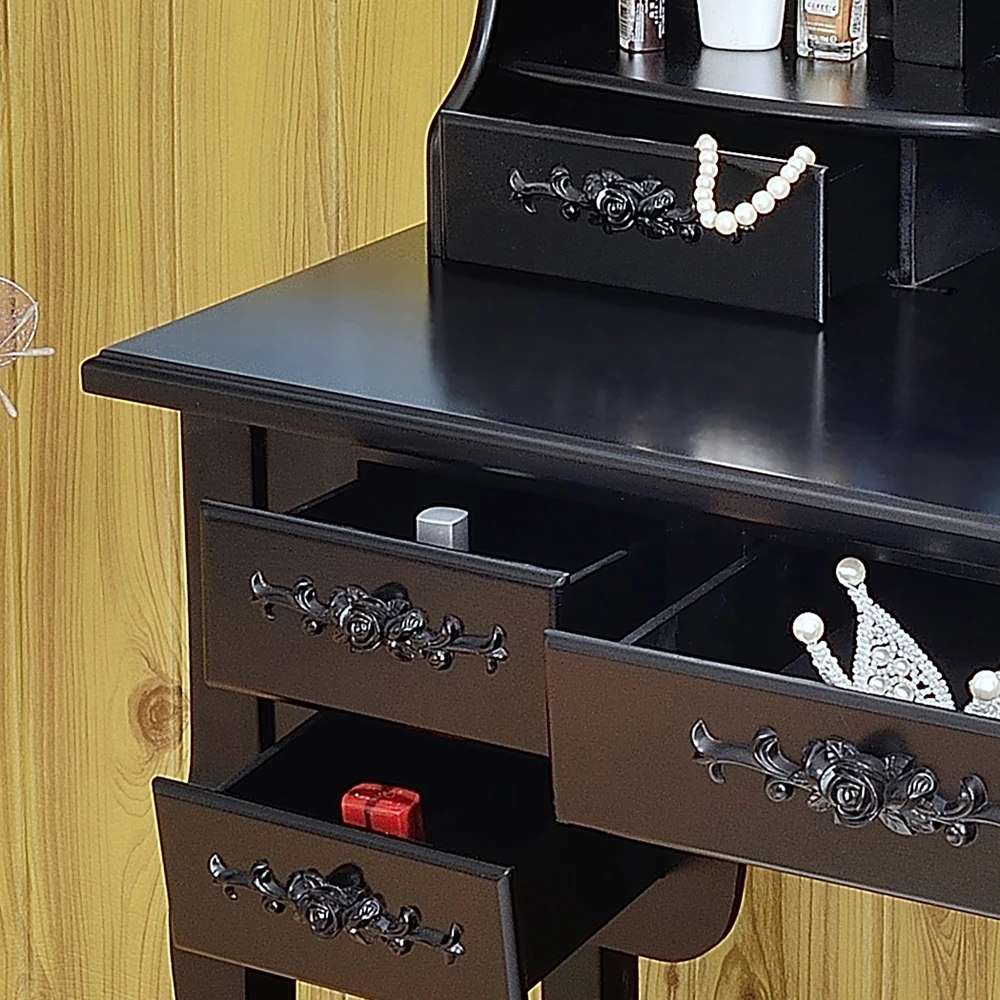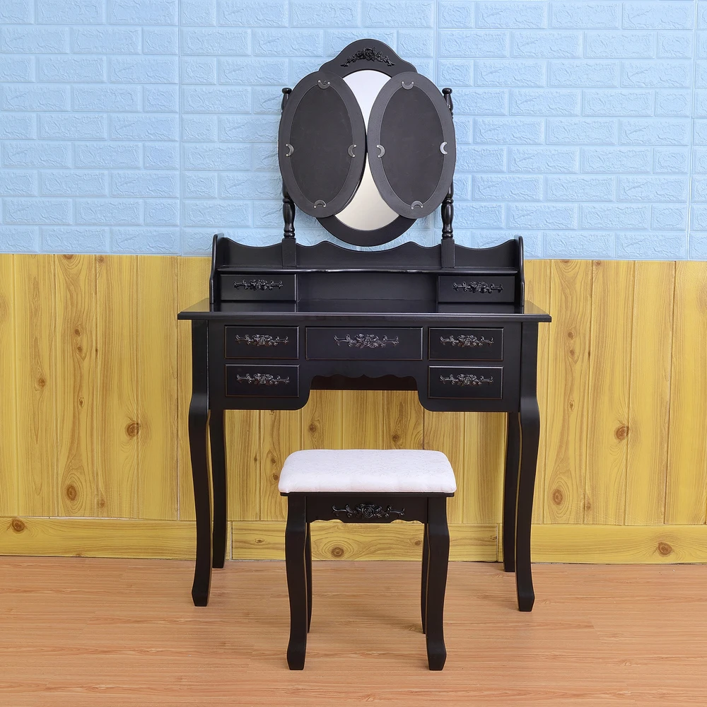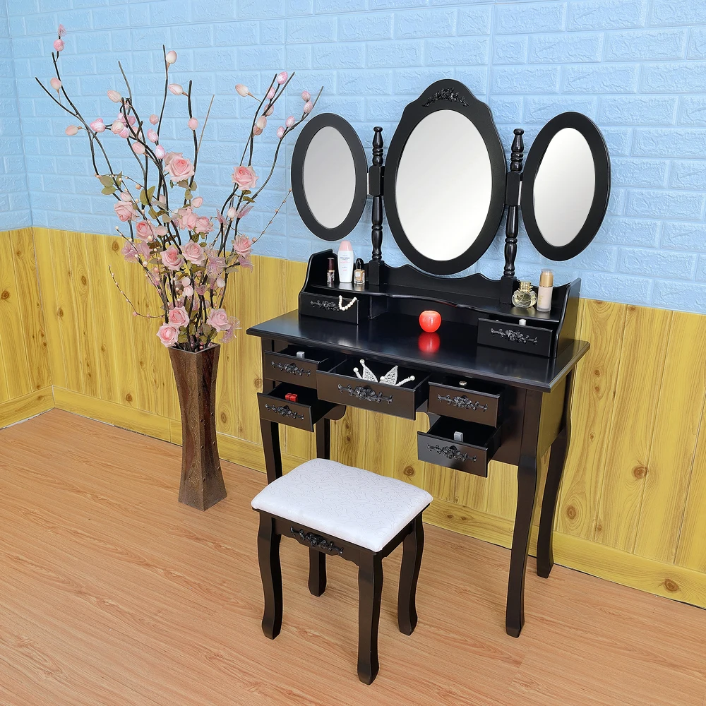 Вы ищете высококачественный и модный туалетный столик? Теперь мы рады поделиться с Вами этим складным 3 зеркалом с 7 ящиками туалетного столика. Этот туалетный столик состоит из трех овальных зеркал, двух ящиков для хранения, пяти ящиков, упрощенных ног королевы Анны и туалетного табурета. Изготовлен из высококачественного MDF материала, он прочный и прочный для ежедневного использования. Зеркала и ящики для хранения на верхней части туалетного столика могут быть удалены, так что вы также можете использовать его в качестве стола. Удобная сборка, поэтому вам просто нужно установить ее часть! С изысканными рисунками гравировки на выдвижных ящиках, зеркалах и табуретах, это также будет хорошим украшением для дома!