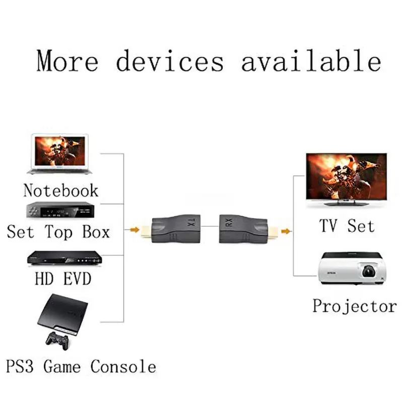 Примените этот HDMI удлинитель с одним CAT5e/6 кабелями для расширения HDTV дисплея до 30 метров 1080p, не только нарушает ограничение длины передачи кабеля HDMI, но laso обладает большей гибкостью и удобством в кабельной конструкции.