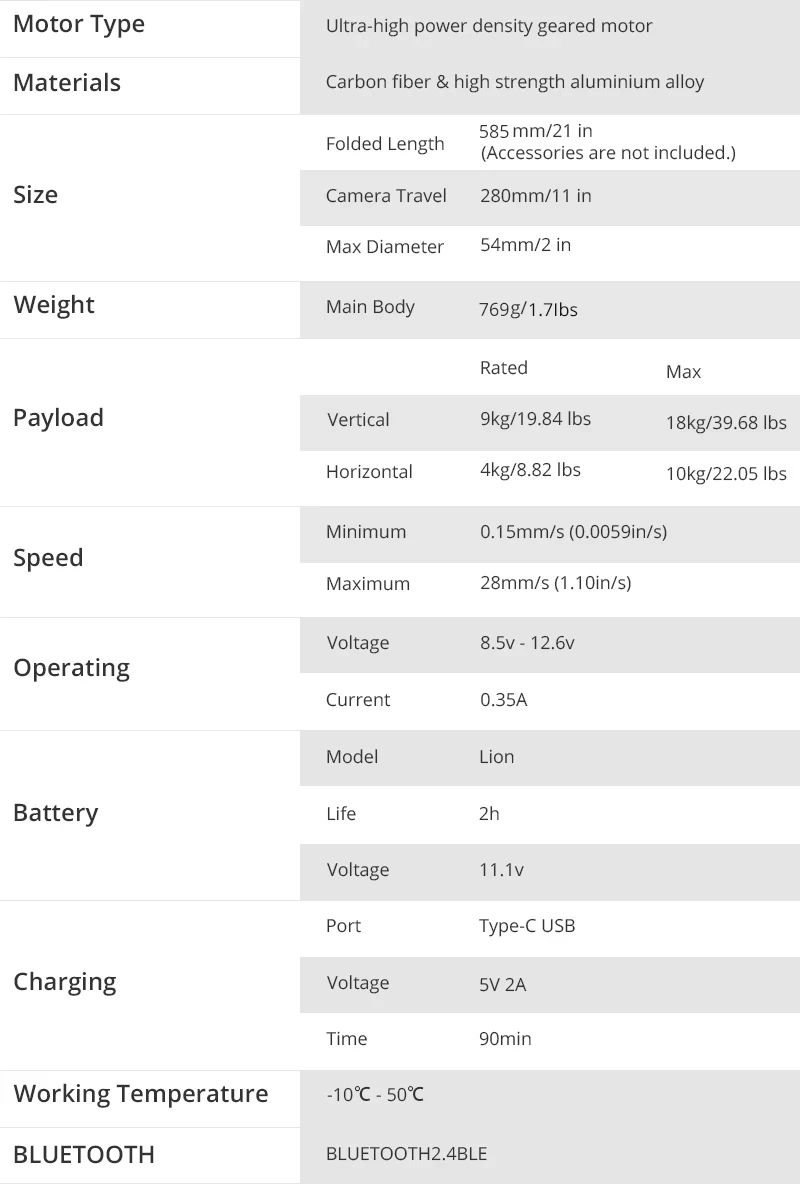 Сверхлегкий корпус из углеродного волокна весит всего 750 г 20 фунтов (9 кг) Номинальная нагрузка; 40 фунтов (18 кг) вертикальная грузоподъемность 9 фунтов (4 кг) Номинальная нагрузка; 22 фунта (10 кг) горизонтальная грузоподъемность Точность движения Управление Точное положение и контроль скорости Пульт дистанционного управления через приложение или дополнительный беспроводной пульт дистанционного управления MOZA экосистема для большего количества возможностей съемки Неограниченное количество Питание Погода водонепроницаемое покрывало для дизайн Технические характеристики: //www.gudsen.com/moza-slypod-spec