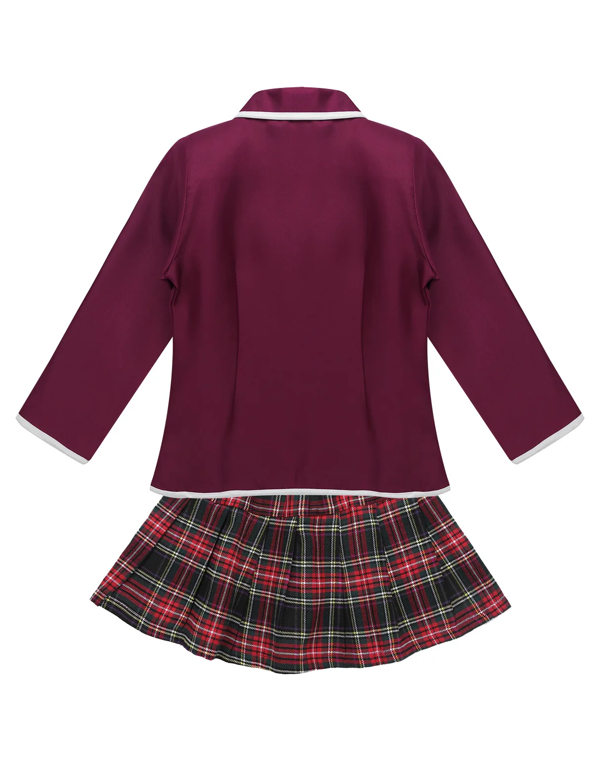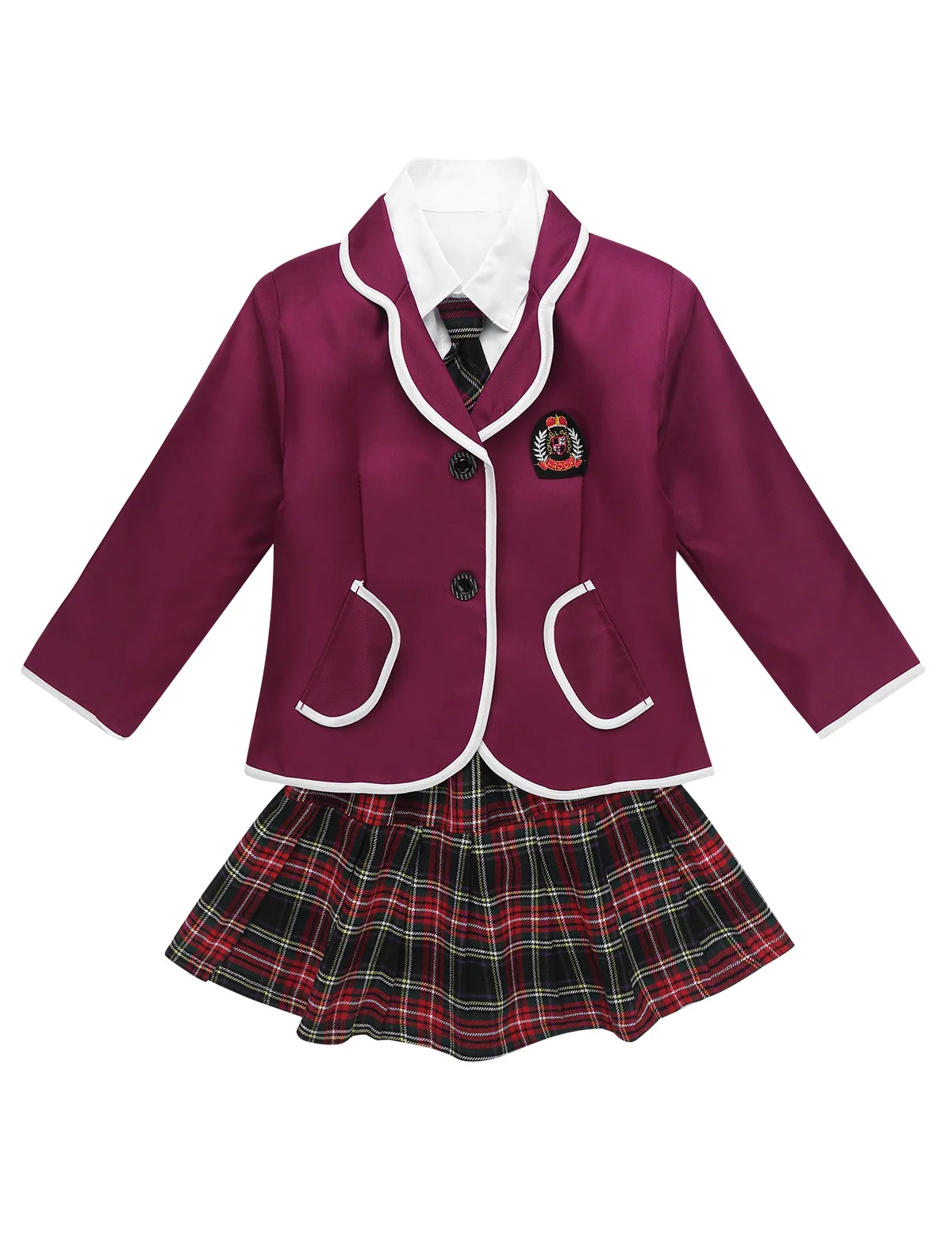 Белая рубашка с отложным воротником, застежка на пуговицах спереди и манжеты. Соответствует галстуку, эластичный пояс, плиссированная юбка с клетчатым узором.