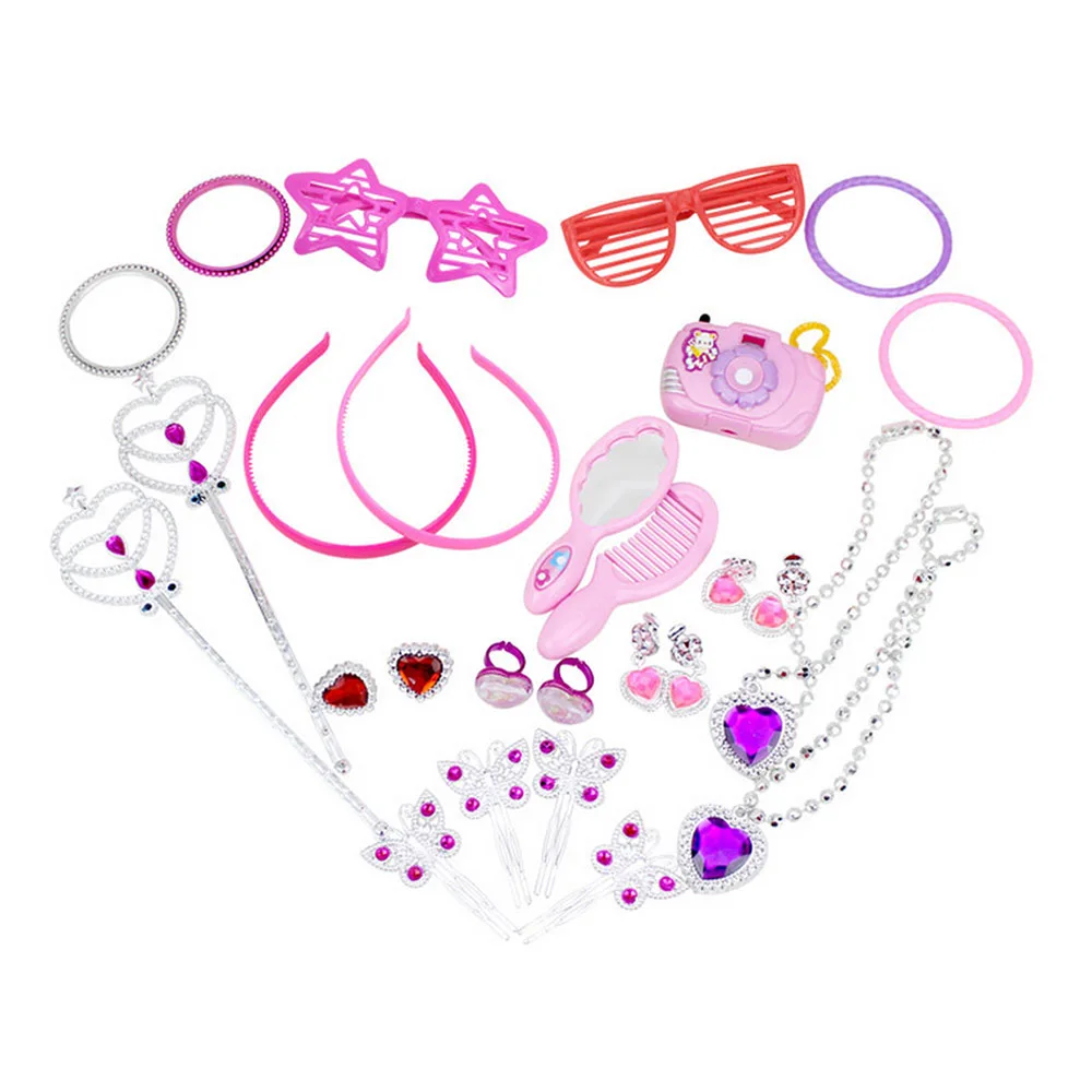 -Включая 6 шт. колец/каждого вида (2 вида), включая 6 шт. браслетов/каждого вида (2 вида), 2 набора расчесок зеркала, 2 камеры, 6 повязок на голову, 6 очков, 6 пар серег, 6 колье, 12 заколка с бабочками, 6 волшебных палочек, в общей сложности 72/мешок.