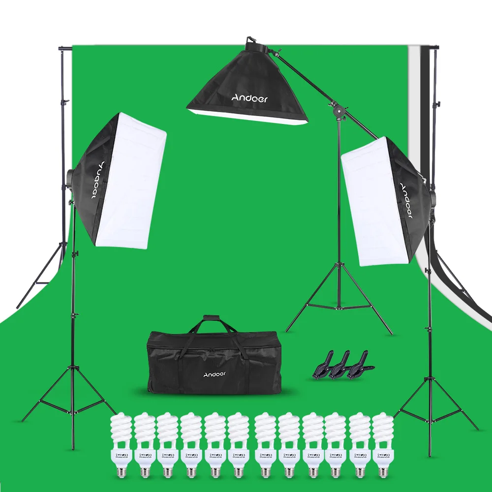 Светильник Andoer для фотостудии включает в себя софтбоксы, консольные палочки, подставки под светильник, розетки для ламп 4 в 1, лампы, фоны (черно-белый и зеленый), подставки для фона, пружинные зажимы и сумка для переноски Andoer, хороший партнер для студийных фотографов.