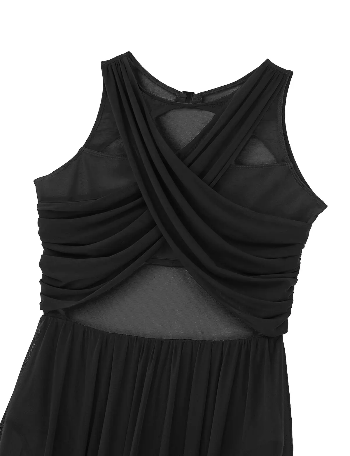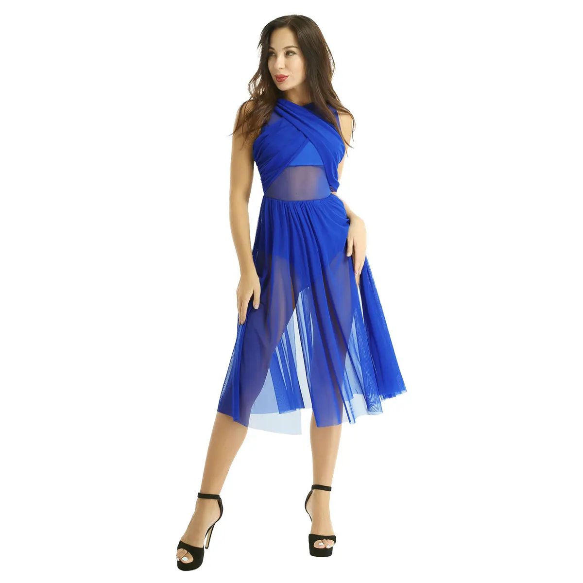 Женское лирическое современное танцевальное трико платье для взрослых, хорошая эластичная ткань. Рукава и открытая спина с пластиковой застежкой на шее, прозрачный сетчатый лиф, перекрещивающийся спереди дизайн с оборками. Приталенная многослойная юбка из сетчатого материала; Спереди Два широких слоя для элегантного образа. Пропускающее воздух, мягкое и удобное в носке изделие. Подходит для лирического танца или классического танца, танцевальных упражнений, соревнований и выступлений и т. д. Пожалуйста, проверьте информацию о размере перед покупкой, рекомендуется ручная стирка, машинная стирка.