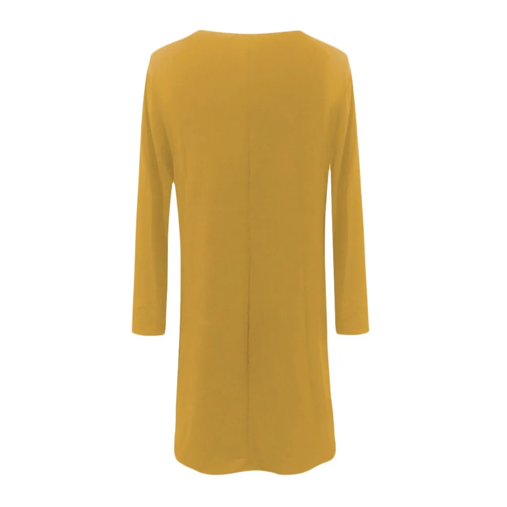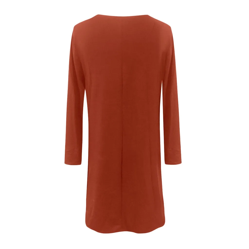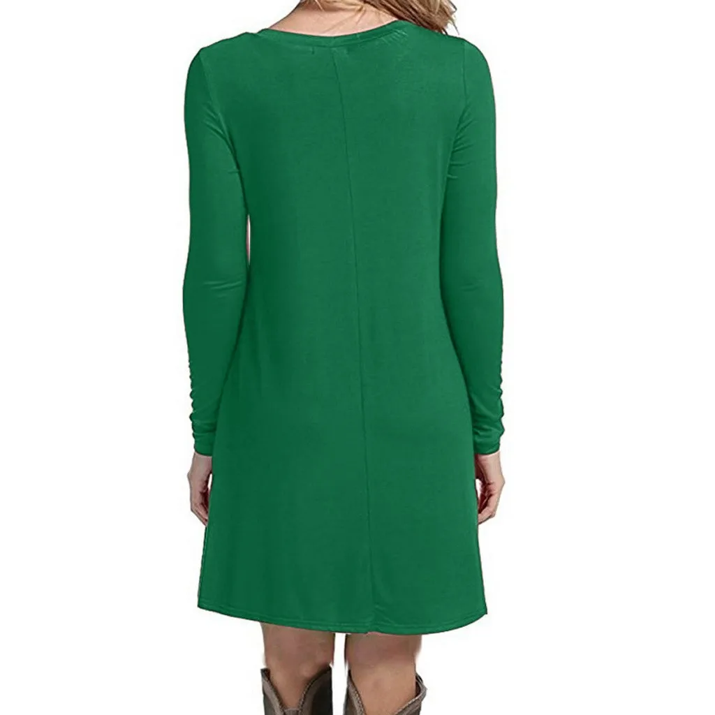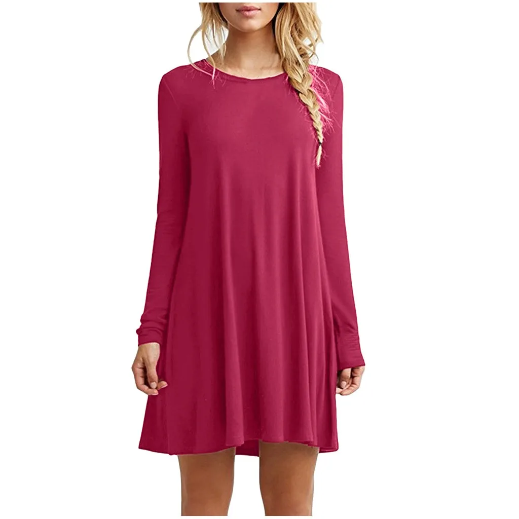 Женское повседневное однотонное свободное платье с длинными рукавами и круглым вырезом мини-платье с оборками