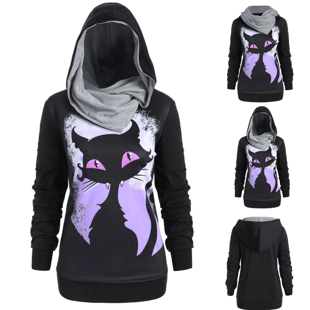 Для женщин Хэллоуин размера плюс 3D кошка печать с откидным верхом свитер с капюшоном топы