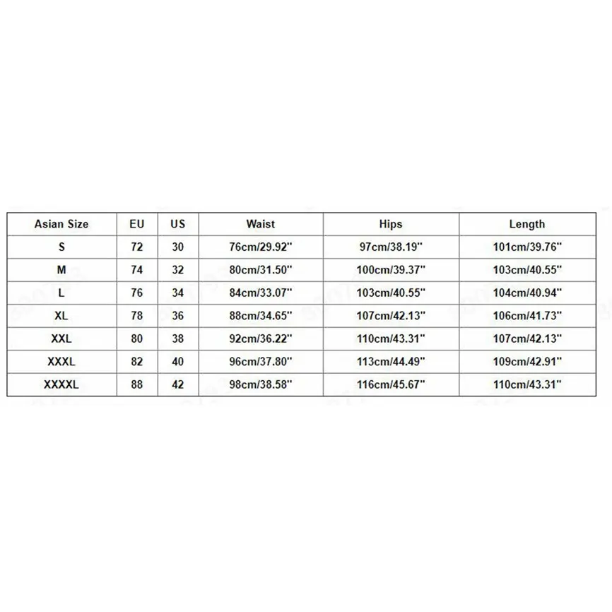 Азиатский РазмерыЕССвяжитесь с намиОбхват талииОбхват бедерДлинаS723076 см/29,92''97 см/38,19''101 см/39,76''М743280 см/31,50''100 см/39,37''103 см/40,55''L763484 см/33,07''103 см/40,55''104 см/40,94''XL783688 см/34,65''107 см/42,13''106 см/41,73''XXL803892 см/36,22''110 см/43,31''107 см/42,13''XХХL824096 см/37,80''113 см/44,49''109 см/42,91''XXXXL884298 см/38,58''116 см/45,67''110 см/43,31''
