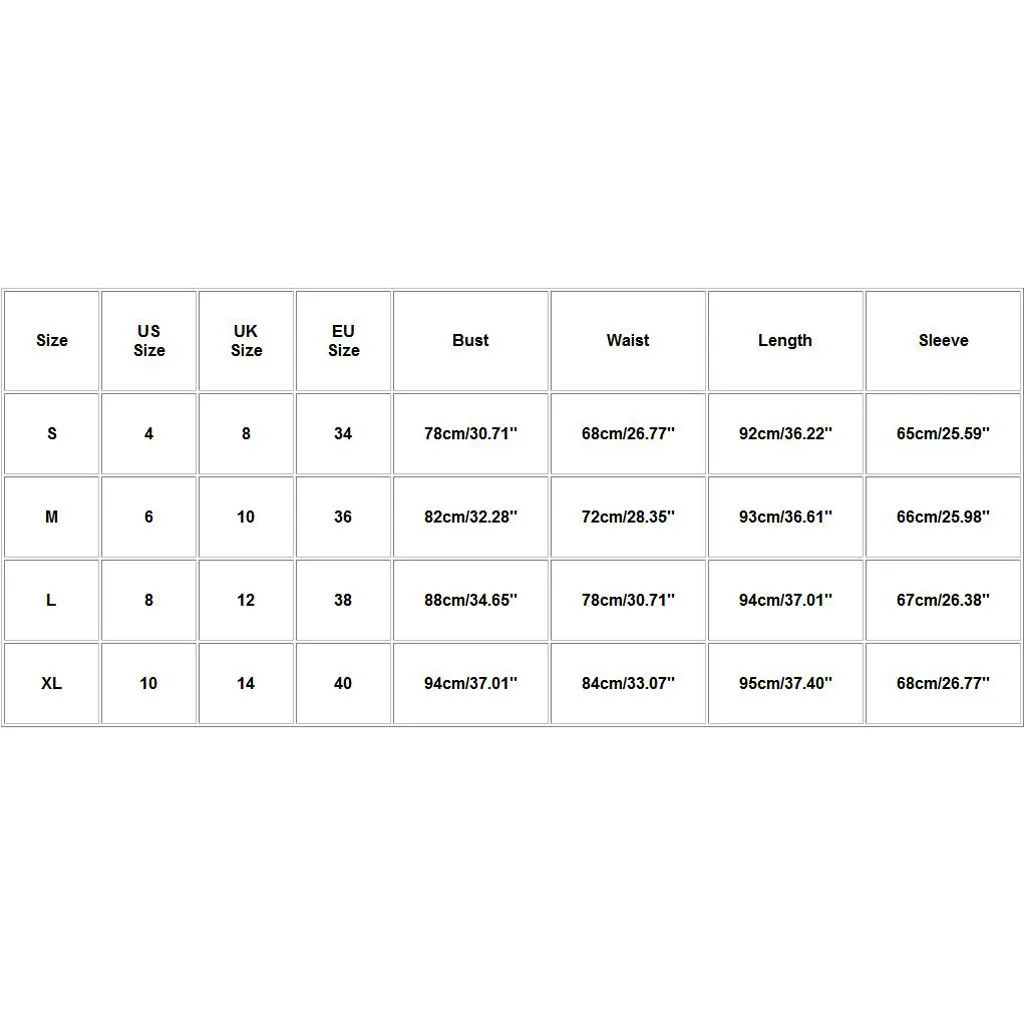 Размер: S Размер США: 4 Размер Великобритании: 8 Европейский размер: 34 Обхват груди: 78 см/30,71 дюйма Талия: 68 см/26,77 дюйма Длина: 92 см/36,22 дюйма Рукав: 65 см/25,59 дюйма Размер: M Размер США: 6 Размер Великобритании: 10 Европейский размер: 36 Обхват груди: 82 см/32,28 дюйма Талия: 72 см/28,35 дюйма Длина: 93 см/36,61'' Рукав: 66 см/25,98 дюйма Размер: L Размер США: 8 Размер Великобритании: 12 Европейский размер: 38 Обхват груди: 88 см/34,65 дюйма Талия: 78 см/30,71 дюйма Длина: 94 см/37,01'' Рукав: 67 см/26,38 дюйма Размер: XL Размер США: 10 Размер Великобритании: 14 Европейский размер: 40 Обхват груди: 94 см/37,01 дюйма Талия: 84 см/33,07 дюйма Длина: 95 см/37,40'' Рукав: 68 см/26,77 дюйма