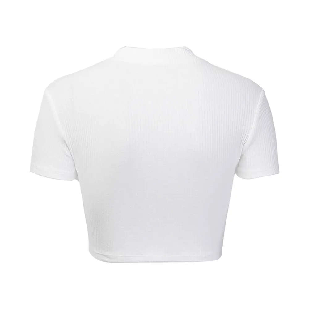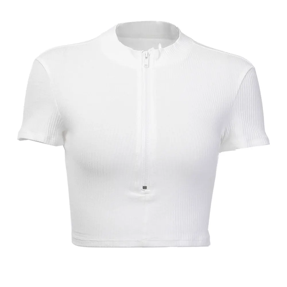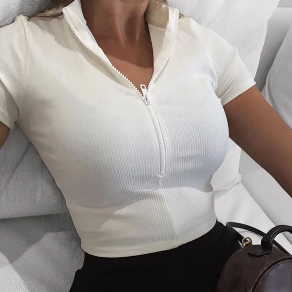 Женские модные футболки 2019 Новый женский стоячий воротник молния полосатый короткий соблазнительный сплошной цвет тонкий крой короткий рукав топы