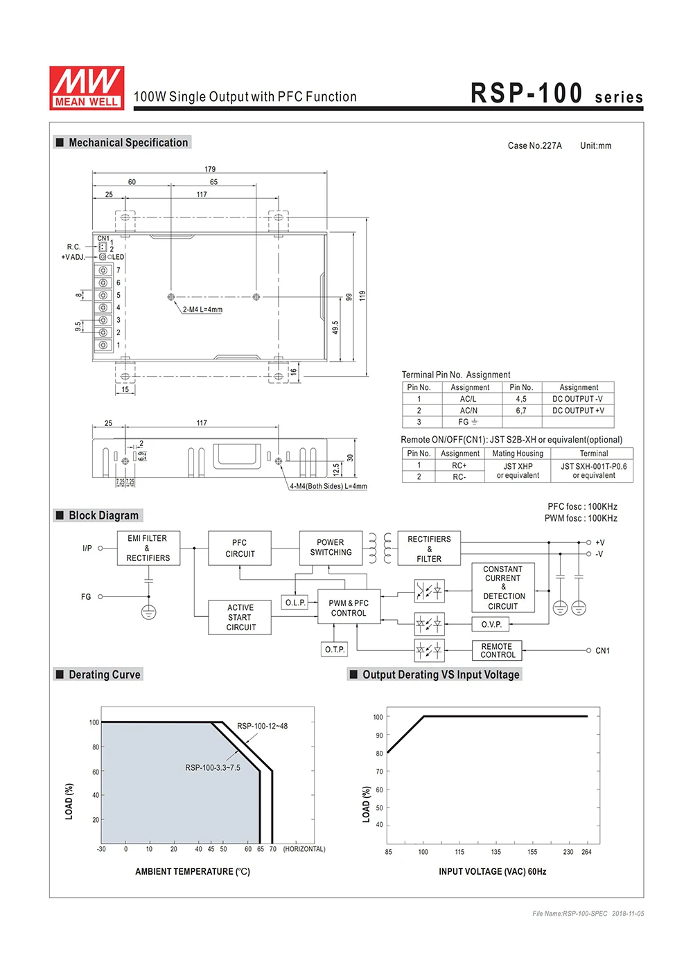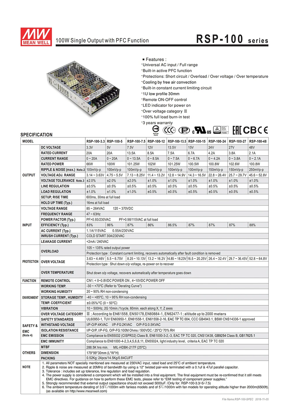 Универсальный адаптер переменного тока в постоянный ток на входе Встроенный активный PFC Функция Защита: короткого замыкания/перегрузки/перенапряжения/перегрева Охлаждение с помощью свободной воздушной конвекции Низкий профиль 1U: 30 мм Встроенная схема ограничения постоянного тока Пульт дистанционного управления Светодиодный индикатор для включения питания Защита от перенапряжения категории III 100% тест на полную нагрузку 3 года гарантии