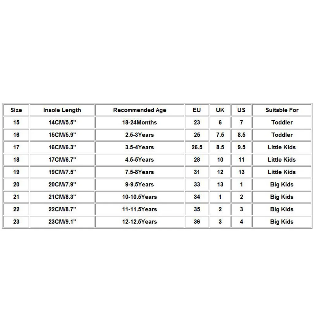 Размер Стельки Длина Рекомендуемый возраст ЕС Великобритания Свяжитесь с нами Подходит для 15 14 см/5,5" 18-24Months 23 6 7 Для детей ясельного возраста 16 15 см/5,9" 2,5, для возраста до 3 лет 25 7,5 8,5 Для детей ясельного возраста 17 16 см/6,3" 3,5-4 лет 26,5 8,5 9,5 Дети дошкольного возраста 18 17 см/6,7" 4,5-5 лет 28 10 11 Дети дошкольного возраста 19 19 см/7,5" 7,5-8 лет 31 12 13 Дети дошкольного возраста 20 20 см/7,9" 9-9.5Years 33 13 1 Дети младшего школьного возраста 21 21 см/8,3" 10-10.5Years 34 1 2 Дети младшего школьного возраста 22 22 см/8,7" 11-11.5Years 35 2 3 Дети младшего школьного возраста 23 23 см/9,1" 12-12.5Years 36 3 4 Дети младшего школьного возраста