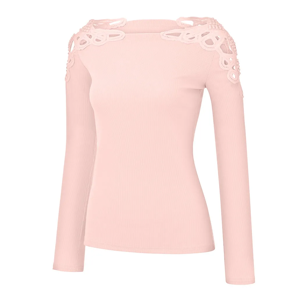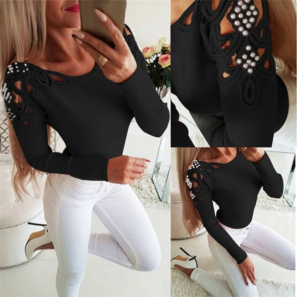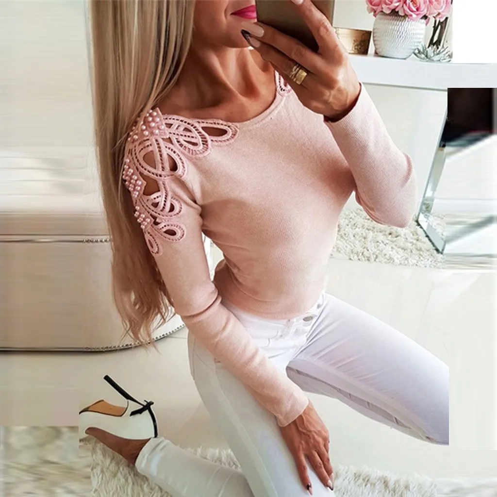 Женская модная однотонная блузка с круглым вырезом и жемчужинами