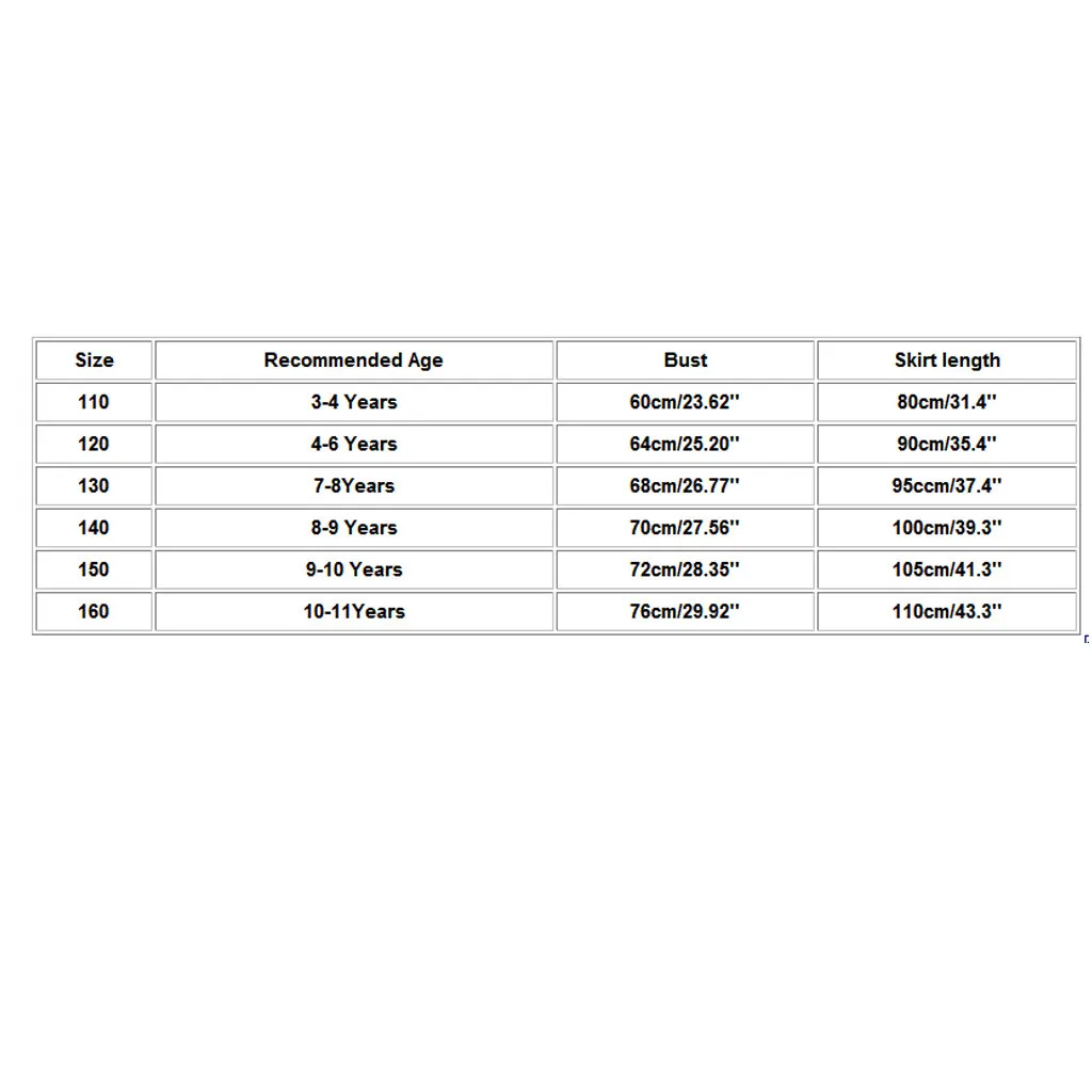 Размер Рекомендуемый возраст Обхват груди Длина юбки 110 От 3 до 4 лет 60 см/23,62'' 80 см/31,4'' 120 От 4 до 6 лет Высота голенища 64 см; 25,20'' 90 см/35,4'' 130 7-8Years 68 см/26,77'' 95ccm/37,4'' 140 От 8 до 9 лет 70 см/27,56'' 100 см/39,3'' 150 От 9 до 10 лет 72 см/28,35'' 105 см/41,3'' 160 10-11Years 76 см/29,92'' 110 см/43,3''