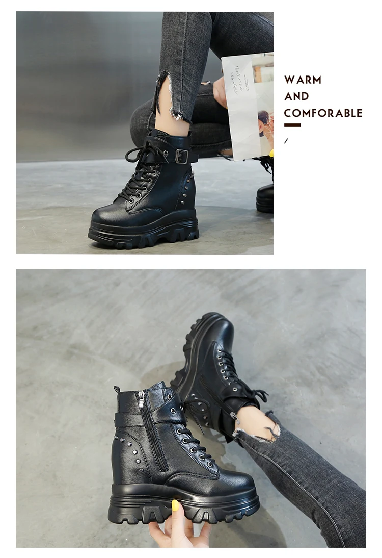 Повседневные женские ботильоны; сезон осень; высокие кроссовки с заклепками на толстой подошве; кожаные ботинки на платформе; Каблук 10 см; зимние теплые ботинки на меху