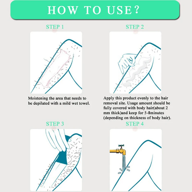 1. После увлажнения области, которую необходимо депиляровать влажным полотенцем, равномерно распределите продукт по области эпиляции, а затем равномерно протрите крем для эпиляции средством.