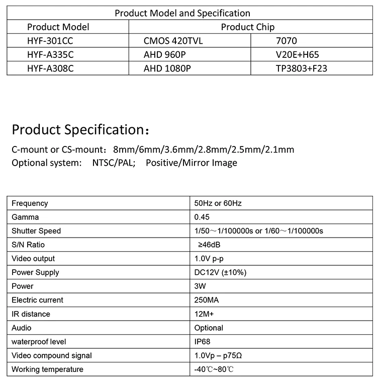 HYF-301CC CMOS 420TVL HYF-A335C AHD960P HYF-A308C AHD1080P