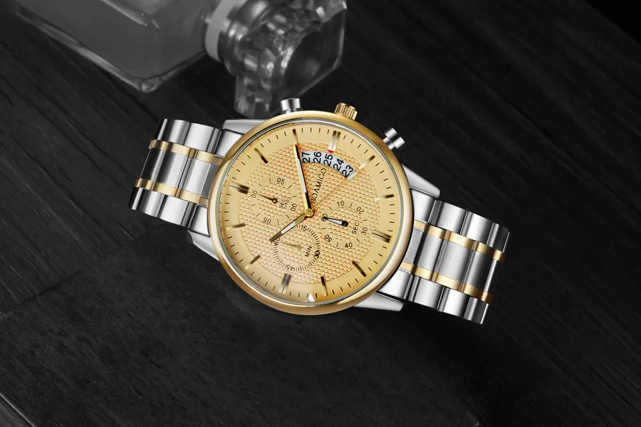 Особенности: 1. Функция: хронограф, минуты и секунды, 1/10 секунды, автоматическая дата, время. 2. Тип: мужские модные роскошные часы 3. Движение: аналоговый дисплей 4. Материал ремешка: нержавеющая сталь 4. Материал ремешка: нержавеющая сталь 6. Это лучшие подарки на Рождество, Новый Год, день рождения и так далее