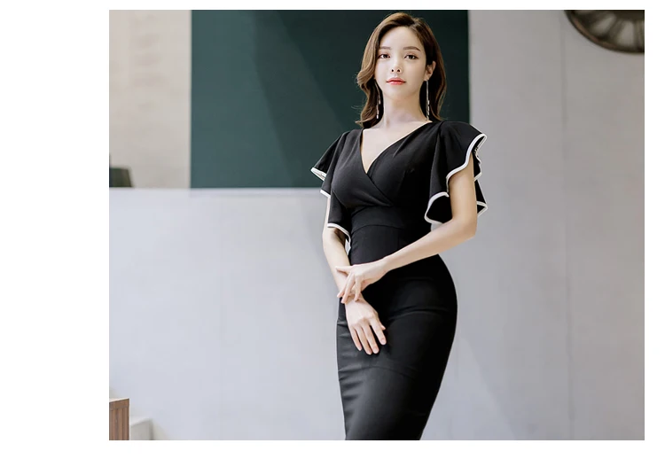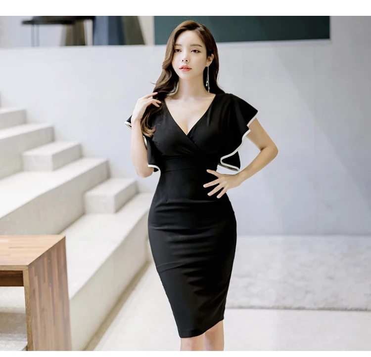 2019 Summer Office Lady Dress Black Small Sexy V-Neck Sleeveless Ruffles Decoration High Waist Elegant Party Dress Women AQ58