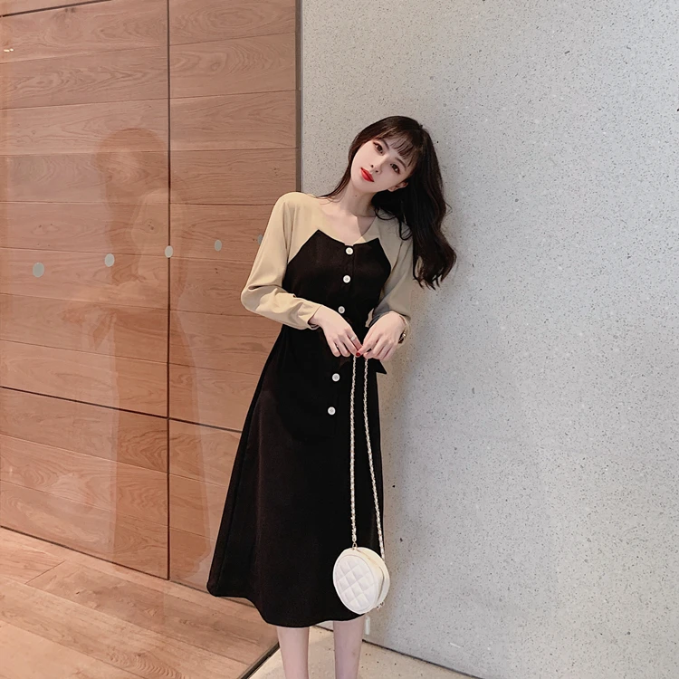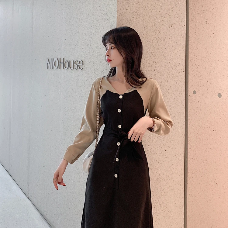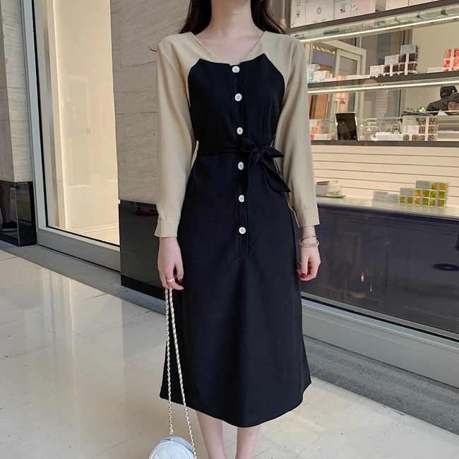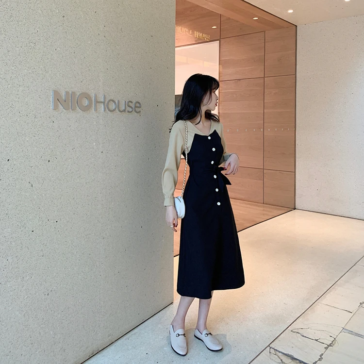 Черная Базовая Платья Длинные женские зимние базовая весенняя одежда с длинными рукавами в стиле пэчворк Рубашка-Платье на пуговицах из искусственного меха, состоящие из двух частей, 1212