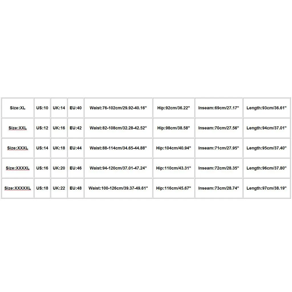Размер США Великобритания ЕС Талия Бедра Внутренний шов Длина XL 10 14 40 76-102 см/29,92-40,16'' 92 см/36,22'' 69 см/27,17'' 93 см/36,61'' XXL 12 16 42 82-108 см/32,28-42,52'' 98 см/38,58'' 70 см/27,56'' 94 см/37,01'' XХХL 14 18 44 88-114 см/34,65-44,88 дюйма 104 см/40,94'' 71 см/27,95'' 95 см/37,40'' XXXXL 16 20 46 94-120 см/37,01-47,24 дюйма 110 см/43,31'' 72 см/28,35'' 96 см/37,80'' XXXXXL 18 22 48 100-126 см/39,37-49,61'' 116 см/45,67'' 73 см/28,74'' 97 см/38,19''