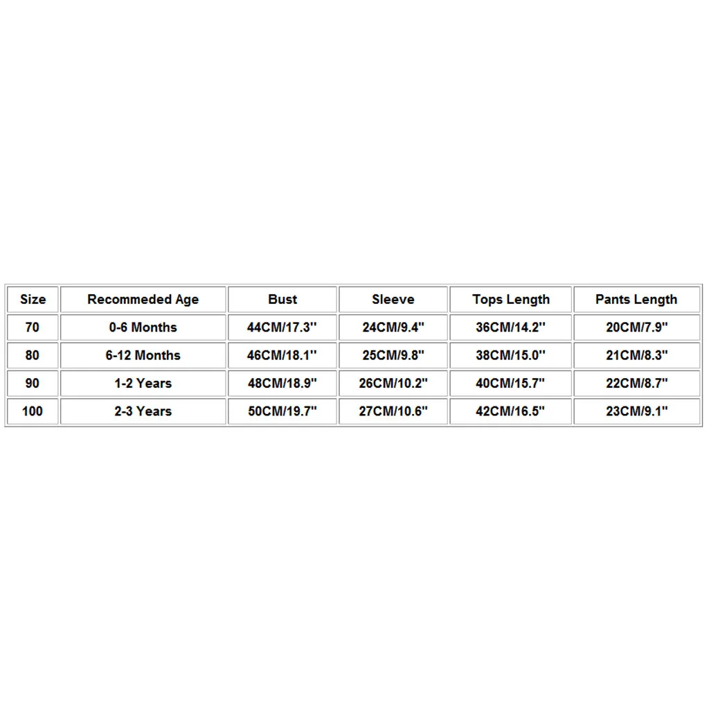 Размер Рекомендуемый возраст Обхват груди Рукава Топы Длина Брюки Длина 70 Для детей от 0 до 6 месяцев 44 см/17,3'' 24 см/9,4" 36 см/14,2'' 20 см/7,9" 80 6-12 месяцев 46 см/18,1'' 25 см/9,8" 38 см/15,0'' 21 см/8,3" 90 Для детей от 1 до 2 лет 48 см/18,9" 26 см/10,2" 40 см/15,7" 22 см/8,7" 100 От 2 до 3 лет 50 см/19,7" 27 см/10,6" 42 см/16,5" 23 см/9,1"