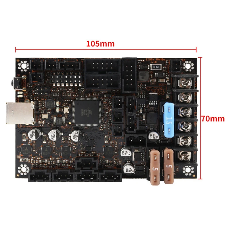 Мощность: 2 входа питания шины. Подогреваемая кровать, 15A 12-24 В (15A преданный предохранитель); Основная мощность 10A 12-24 В: двигатели, логика и вентиляторы (5A преданный предохранитель) + экструдеры (5A выделенный предохранитель)