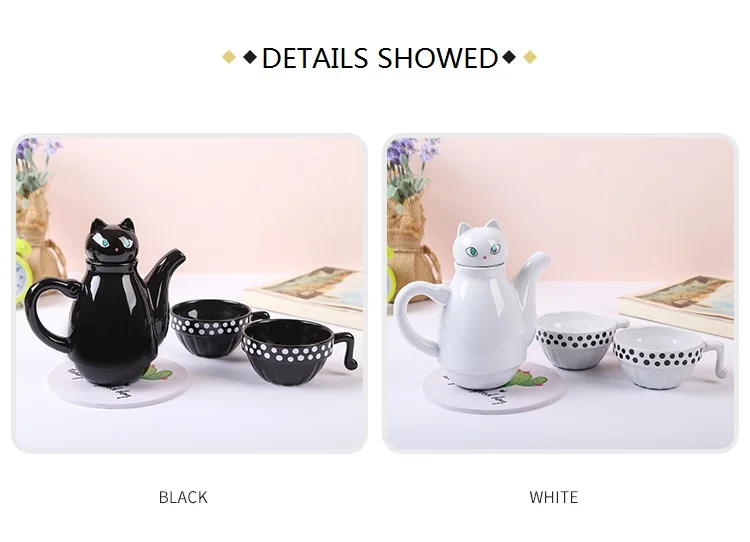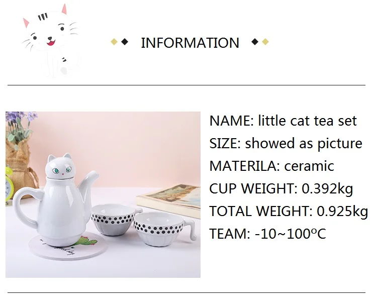 W0467 Название: маленький чайный набор с кошкой Размер: как показано на картинке Материал: керамика + нержавеющая сталь Вес чашки: 0,392 кг Общий вес: 0,925 кг Емкость: 400 мл Команда:-10 ~ 100 °C Посылка: Сейф