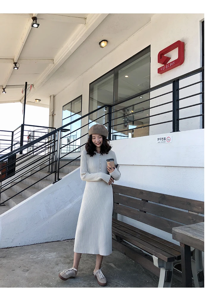 Зимние Базовые платья Длинные женские модные с длинным рукавом офисные темпераментные женские вязанные платья-свитера на пуговицах черная Корейская одежда 020