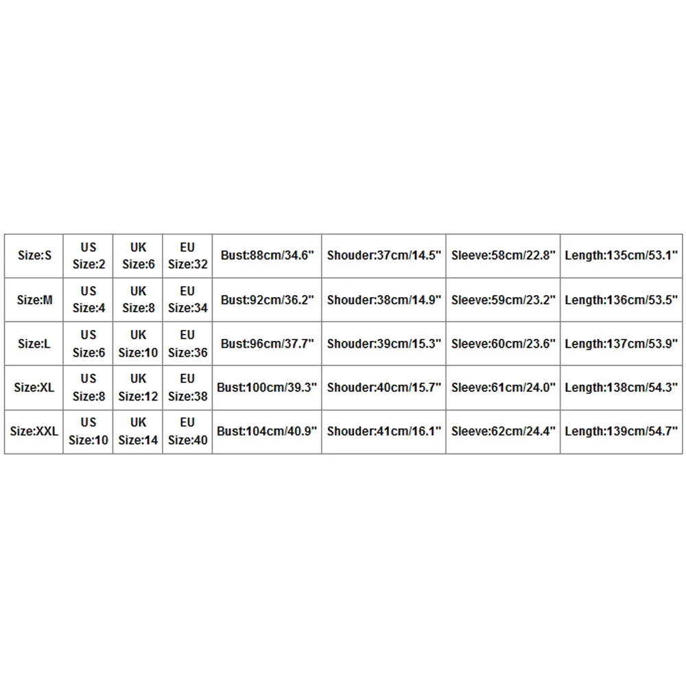 Размеры Нам Размеры UK Размеры ЕС Размеры Обхват груди Блузки, ширина плеч Рукава Длина S 2 6 32 88 см/34,6" 37 см/14,5" 58 см/22,8" 135 см/53,1" М 4 8 34 92 см/36,2" 38 см/14,9" 59 см/23,2" 136 см/53,5" L 6 10 36 96 см/37,7" 39 см/15,3" 60 см/23,6" 137 см/53,9" XL 8 12 38 100 см/39,3" 40 см/15,7" 61 см/24,0" 138 см/54,3" XXL 10 14 40 104 см/40,9" 41 см/16,1" 62 см/24,4" 139 см/54,7"