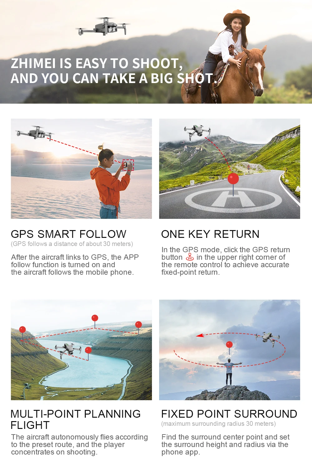 Функция: 5G Wi-Fi FPV, ESC камера, приложение управления полетом, GPS автоматическое возвращение, режим следования за мной, режим высоты, режим полёта путевой точки, оптическое позиционирование потока, окружность фиксированной точки, жесты фото/видео, креативное видео, Безголовый режим, фиксированное переключение, 2-уровневая регулировка скорости полета, один ключ Взлет/посадка, один ключ возврата